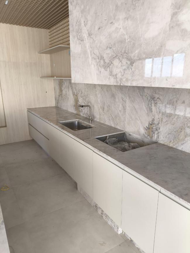 Área gourmet, com ilha central em Mármore Branco Paraná Calacatta